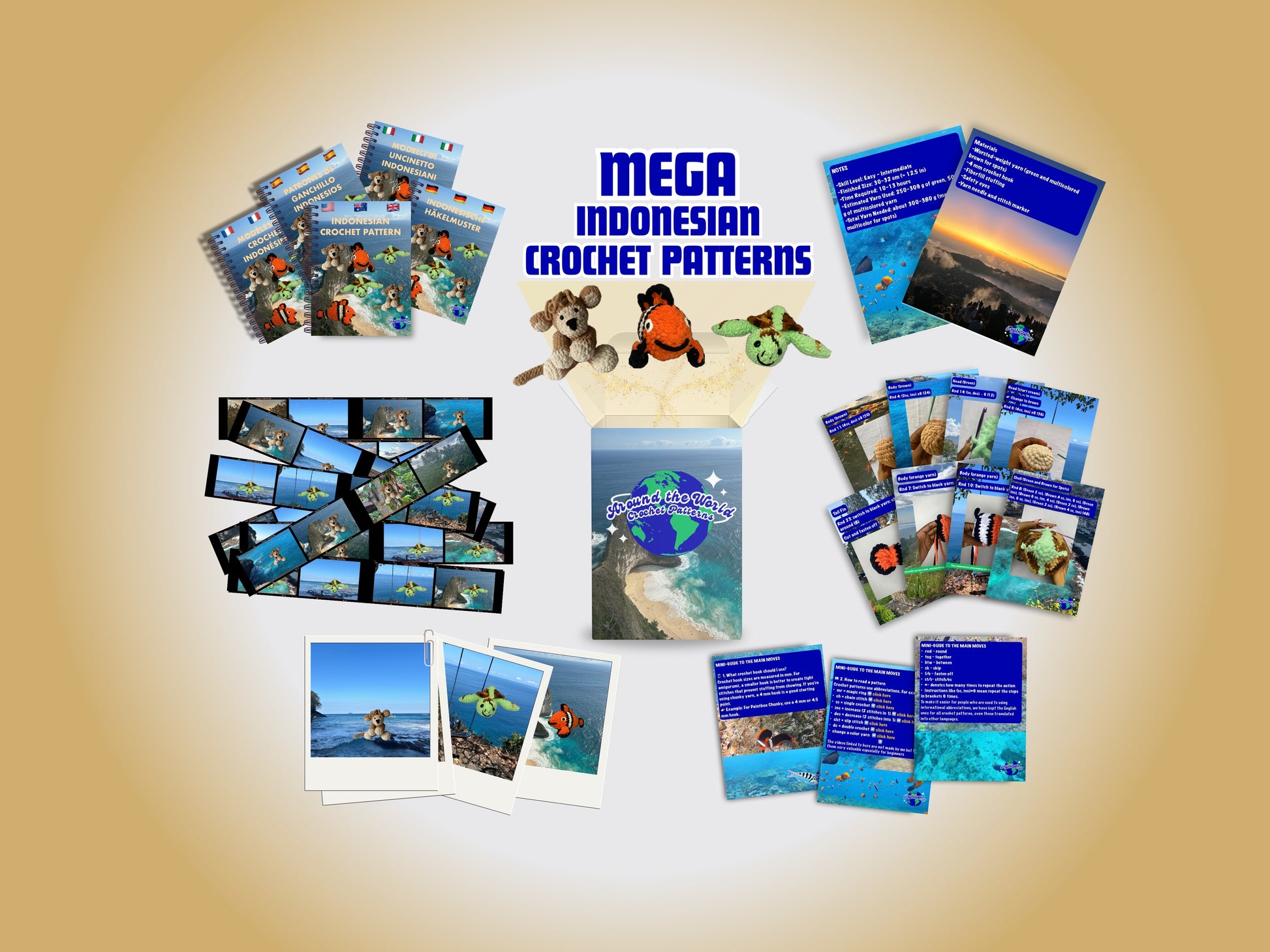 MEGA INDONESIAN BUNDLE: 3 CROCHET PATTERNS: MONKEY, SEA TURTLE AND CLOWN FISH + EBOOK Your Passport to Crochet: A Beginner’s Journey with Around the World Patterns