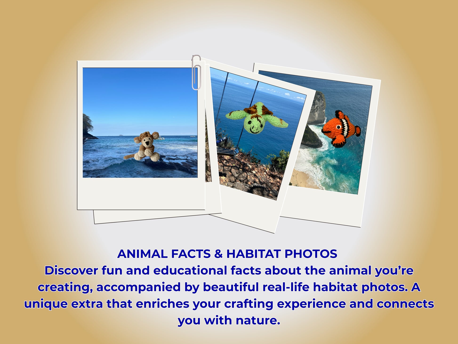 Discover fun facts and real photos of the animals’ natural homes – learn as you crochet!
